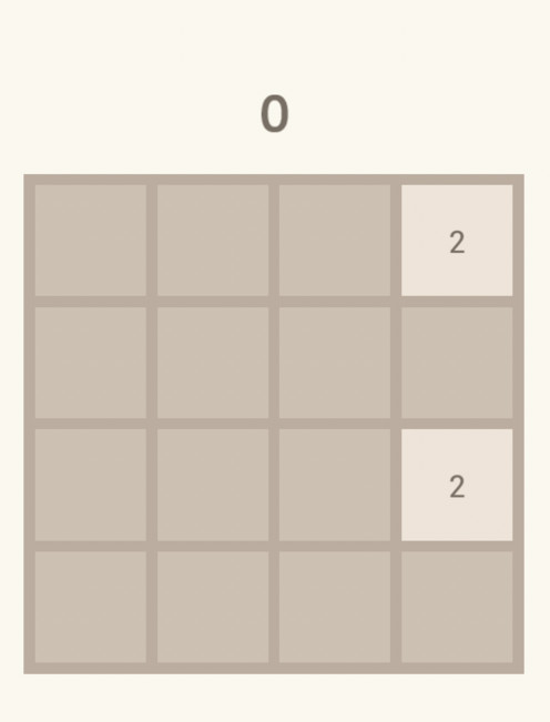 1、这是刚打开游戏的界面,有两个2,并且我们需要知道每次移动后都会出现一个2,只有相同的数才能相加,也就是每次合并之后数据都会翻倍。这些是我们需要知道的。