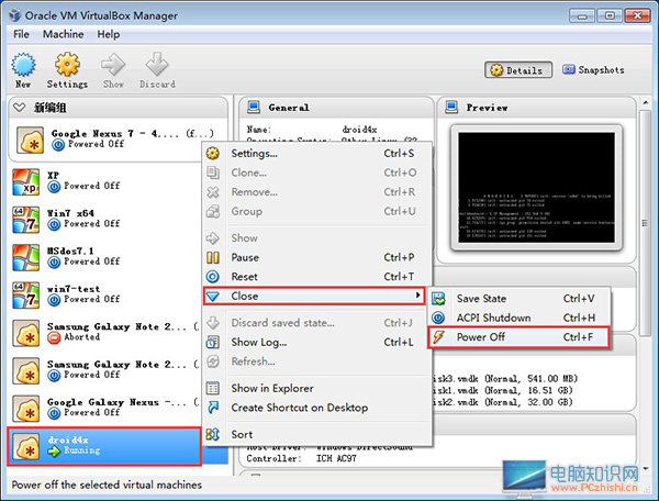 2.打开:Oracle VM VirtualBox Manager之后,如下图所示,首先看看:droid4x的运行状态是不是“Running”,意思是正在运行中,那么选中点击鼠标右键,依次点击:Close--PowerOff,如果运行状态是:“PowerOff”的直接跳过这步