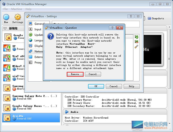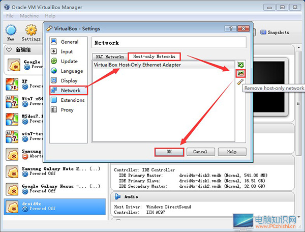 4.在VirtualBox-Settings界面下点击:Network--Host-only Networks,再点击“-”减号删除--OK
