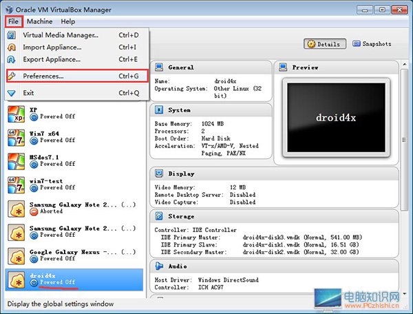 3.再点击Oracle VM VirtualBox Manager管理器顶部的:File--Preference...
