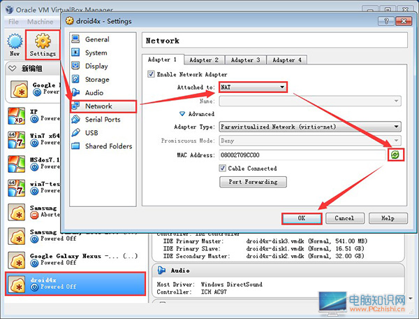6.再选中:droid4x--Settings--Network--NAT--点击刷新按钮一下--OK