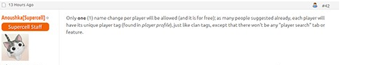 原文:Only one (1) name change per player will be allowed (and it is for free); as many people suggested already, each player will have its unique player tag (found in player profile), just like clan tags, except that there won't be any "player search" tab or feature.