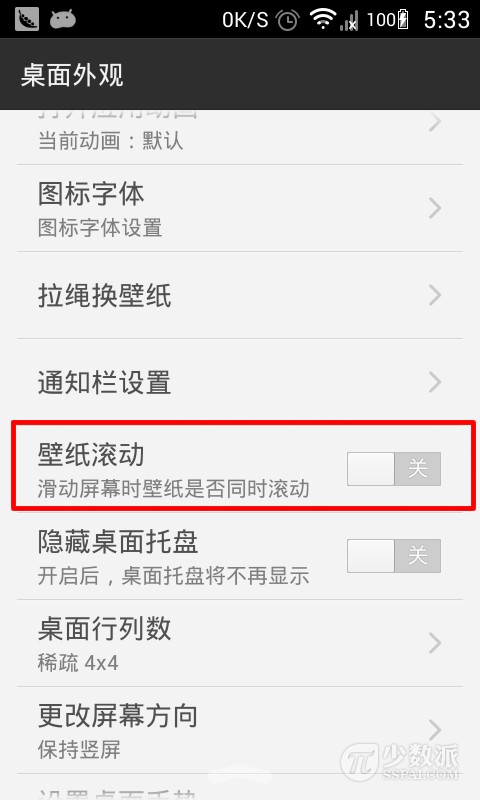 GO桌面是3G门户重量级应用,坐拥几千万用户以及众多主题,曾是笔者的装机必备,可惜越来越臃肿了。设置步骤:进入桌面设置,将壁纸滚动选项关闭即可!