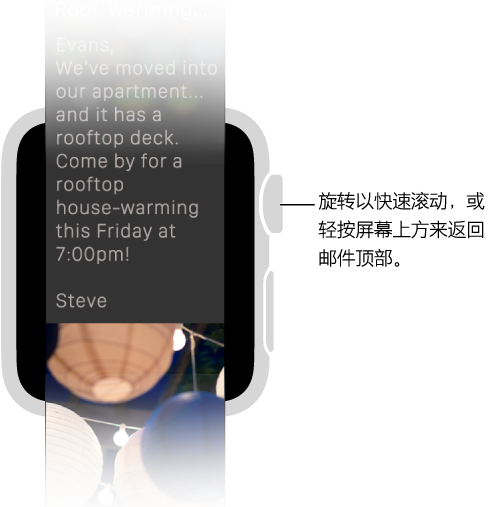 返回长邮件顶部: 旋转 Digital Crown 表冠来快速滚动浏览,或只需轻按一下屏幕顶部即可。