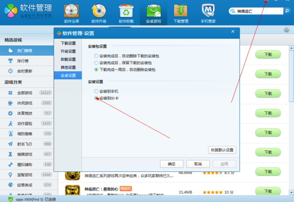 其实,下载安卓游戏的时候,你可以直接将游戏安装到sd卡的,通过电脑管家如下设置即可!