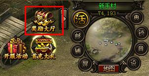 进入游戏后,点击右上角小地图旁“奖励大厅”按钮,如图: