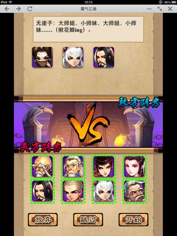 如图所示,依然是空见打头(空见只是一种英雄的代号,只要是蓝不多,抗事儿的弟子加高等级化功大法即可,其他主动技能拿掉),这样可以保证李秋水吸走的内力低于你化她的内力。随后上外功,aoe在前。如果你的段誉或者无涯子是主力,可摆在干掉李秋水的弟子后面。童姥和虚竹有暴击,可以选择闪避型弟子对抗,也可以选择血牛加斗转星移,亦或者堆格挡,依自己的情况而定。逍遥三老还多个虚竹,最后三个人不要都摆内功