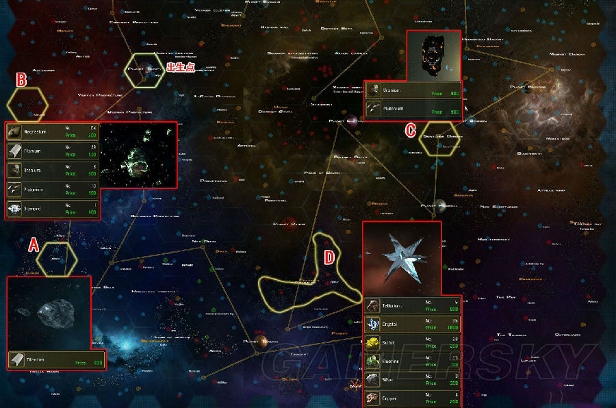 普通小行星出不了好矿,一般只有100-300块,上图是几个价钱好一些的矿以及相对安全的位置。