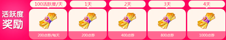 每日达成活跃度100即可领取200点券,每月最多可以抱走6000点券!