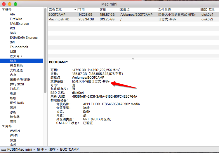 第三步、在Mac界面,点击左侧“储存”,在右侧窗口,找到“文件系统”,您就可以看到Mac硬盘格式和容量了