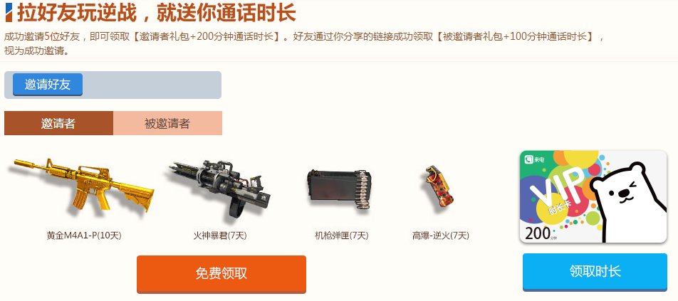 3、成功邀请5位好友,即可领取【邀请者礼包+200分钟通话时长】。好友通过你分享的链接成功领取【被邀请者礼包+100分钟通话时 长】,视为成功邀请。(注:需要是7天以上好友并且好友QQ等级在2级以上,邀请人和被邀请好友均需要有逆战的角色)。
