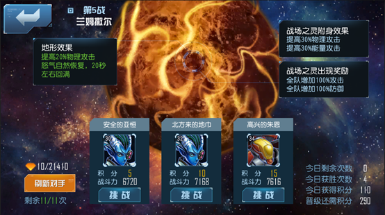 玩家作为挑战者进行战斗,每次战斗都会在一个系统分配的星球上进行,不同的星球会有自己的地形效果。并且每个星球上都会有一位守护此地的战场之灵,它会附身在对手身上,阻碍挑战者。如果能成功击杀战场之灵,则本场战斗中,挑战者全队英雄都会获得大幅增强。