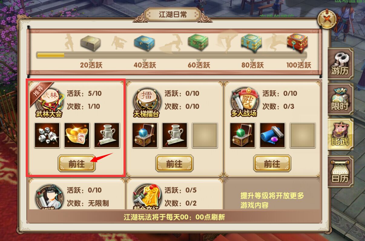 每日0:00-22:00期间,点击游戏界面活动功能延展中的“江湖日常”按钮并进入,在“比武”选项卡中找到“武林大会”,点击“前往”即可加入玩法。