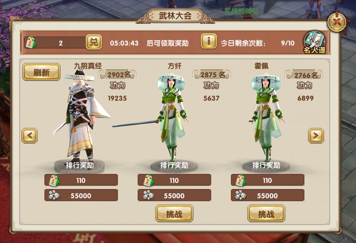 武林大会玩法为递进式单人镜像挑战模式,玩家初始默认在武林大会最后一名,打败排行榜中排名比自己高的玩家镜像,即可取而代之获得该排名。同理,如果其他玩家成功击败你的镜像,当前排名则被对方取代。玩家每天可进行10次挑战,每天22:00以后发放排行奖励。22:00-0:00为结算时间,无法进行排名挑战。