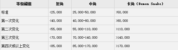 标准:短角,恶魔值小于25000,中角,恶魔值在25000和50000之间,长角(Demon Snake),恶魔值大于50000