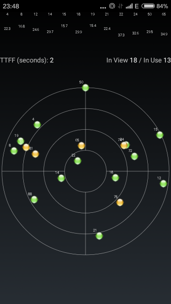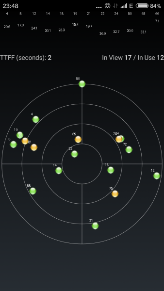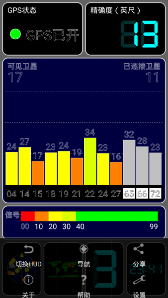 测试结果为:手机重启后首次定位时间为32秒,再次定位时间仅为2秒。两款测试软件连接卫星数为11—13颗。而我之前用V5时多数情况下连接卫星数为6-9颗左右。