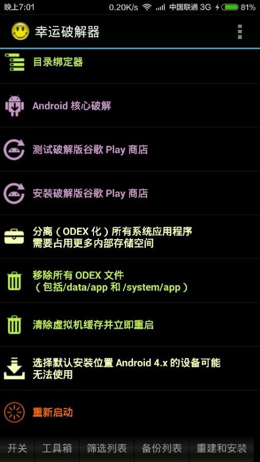 重启手机就在可以了,教程至此完毕,你可以试试看,以后重启就不需要读条了。记得安装了新应用以后要打开幸运破解器优化哦
