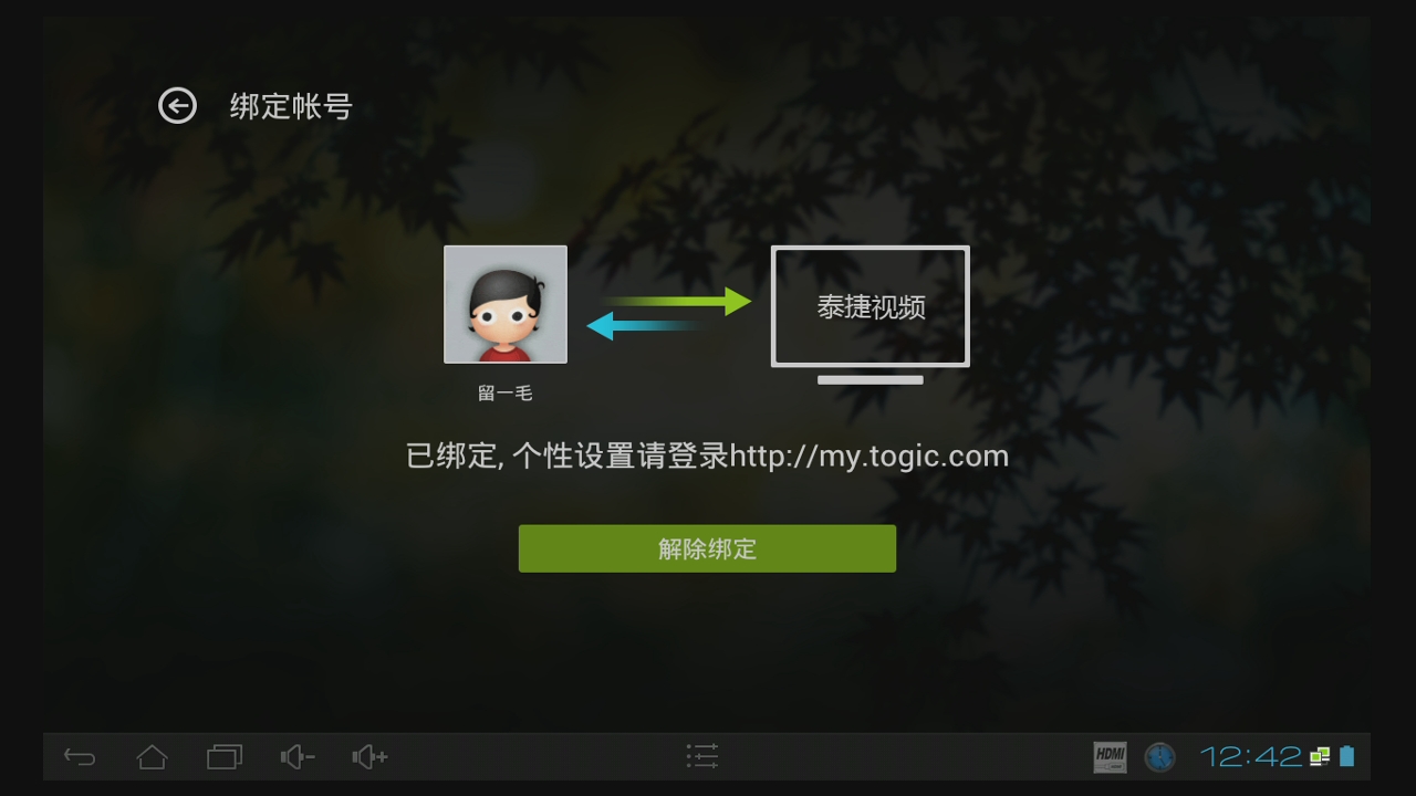 四、输入配对码之后,按确定进行绑定,绑定成功之后6个数字的配对码将变成你的绑定账号,如果配对码没有变化则说明绑定不成功,按解除绑定可对账号进行解绑,如图: