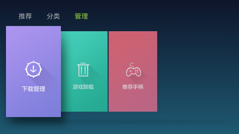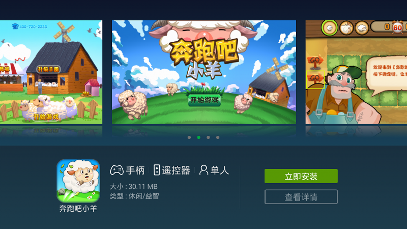 依旧是熟悉的卡片式布局,根据游戏类型分为“休闲益智” “飞行射击” “动作冒险” “棋牌桌游”四大板块,另外也根据遥控操作模式划分了“手柄专区” “遥控器专区”。