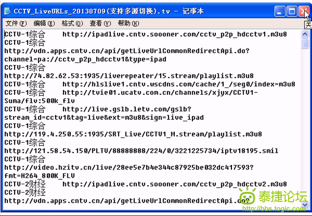 将寻找到的视频源,编辑内容为频道名+空格+url(注:空格可以换成英文逗号,频道名和url中不要有空格)