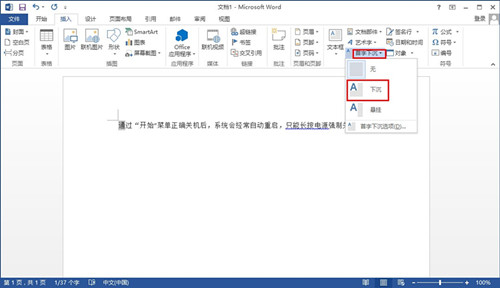 2、现在,在“文本” 组中,单击“下沉”按钮。这将打开一个下拉菜单,各类下沉。选择一个要应用到您的文档。