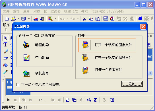 打开gif转视频软件,会弹出一个启动向导,如下图,选择“打开一个现有的图象文件”。