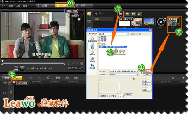 首先在会声会影主界面上方选择“2编辑”,再点击右上方“导入媒体文件”的文件夹图标按钮,弹出“浏览媒体文件”窗口,找到素材“爱情公寓3之恶搞新白娘子传奇.mpg”,双击视频或点击“打开”之即可将其导入会声会影主界面的“视频素材库”中。有时发现视频无法导入到软件上,那事先就需要使用万能视频格式转换器来转换格式,再导入。
