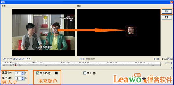 弹出“修剪”视频滤镜的参数设置界面窗口。窗口中时间轴的首尾处默认各有一个菱形的标记,称为“关键帧”,选中并调整两个关键帧的宽度、高度及位置。可在两关键帧中间添加新的关键帧,调整长方形的位置,使它恰好挡住人脸。填充色可设置为白色。 此步其实是添加了跟踪效果,让马赛克跟随镜头。然后点击“确定”返回。