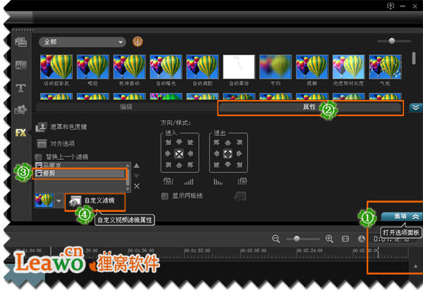如图所示,首先设置“修剪”参数。步骤:“打开选项面板”--> “属性”--> 点击选择“修剪”视频滤镜 --> 点击“自定义滤镜”按钮。