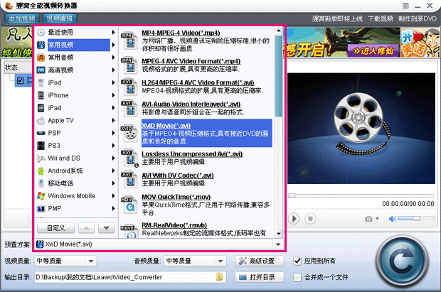 所有类型视频转到MP4/3GP/MPG/AVI/WMV/FLV/SWF。