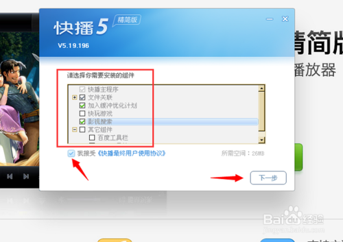 如图,这就是安装界面,要注意的是框框里的勾,有一些是用不到的把它去掉,这样就不会浪费内存了。但是下面协议的勾勾一定要打上去哦,不然进行不了下一步的。