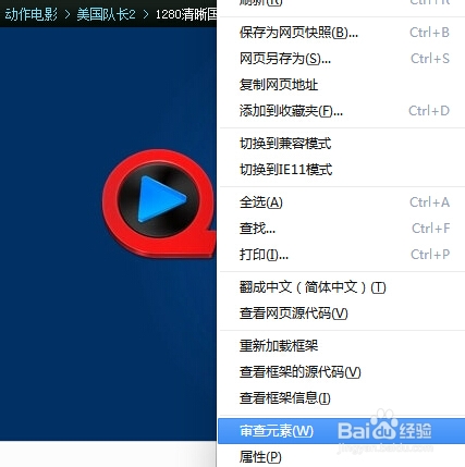 打开视频播放页,也就是显示播放器窗口的这个网店,在视频播放窗口点击右键,选择“审查元素”
