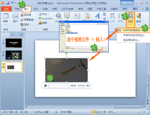 新建并打开PPT文件,再新建幻灯片后。插入视频,PPT支持avi、asf、wmv等格式视频,操作步骤是点击“插入”下拉菜单中的“视频”-“文件中的视频”,弹出打开文件夹,找到相应视频并导入。如图所示。