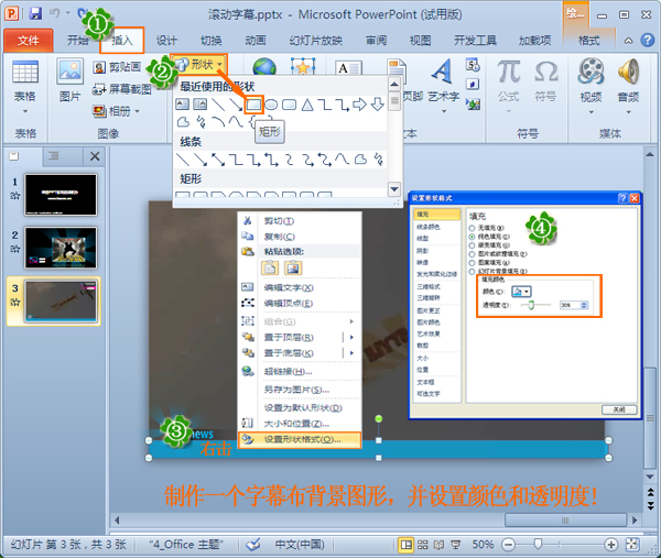 准备添加字幕了,为了好看些,我们也可以添加一个浅色图形,做为背景图片。步骤是点击“插入”,下拉菜单中选择“形状”,会出现很多的样式形状。选择矩形,然后在幻灯片上的视频下方画出一个矩形来。