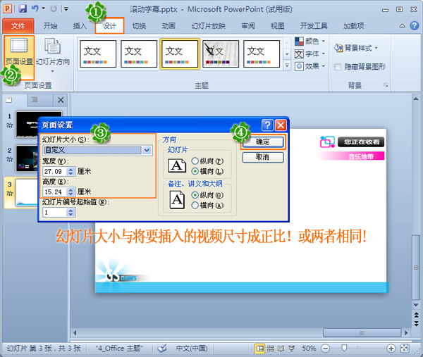 将幻灯片的大小设置一下,幻灯片大小与将要插入的视频尺寸(分辨率)成正比,或两者相同最佳!步骤:点击“设计”-“页面设置”,打开页面设置对话框,填写设置幻灯片的宽度和高度,幻灯片方向为横向,然后点击“确定”返回。