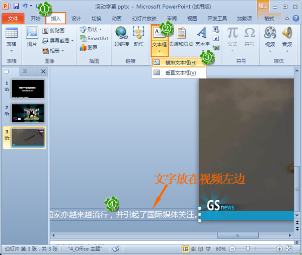 插入文字做为字幕。步骤是点击“插入”,下拉菜单中选择“文本框”-“横排文本框”,然后鼠标在幻灯片上的视频的左下边点击一下,就会输出框,将文字输入进去就好了。文字大小、颜色都可以调整的。