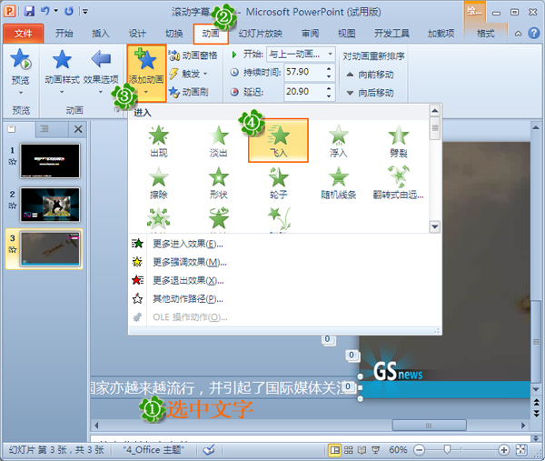 让字幕变成滚动状态,那就要给文字添加一个动画特效。如图所示,先选中文字,然后点击“动画”,下拉菜单中选择“添加动画”,子下拉菜单中选择一个“飞入”特效。如图所示。