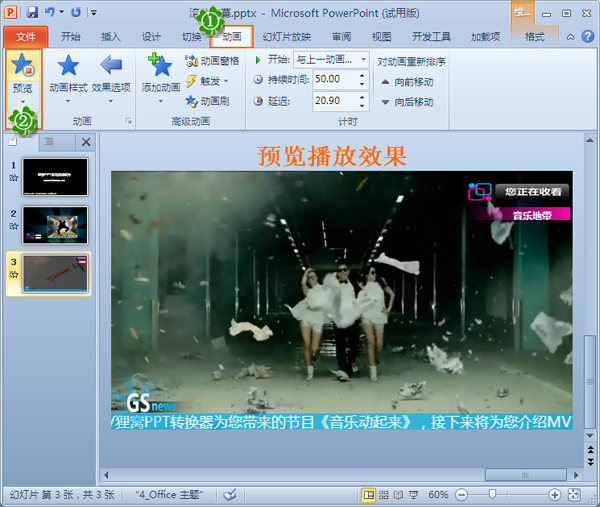 添加好特效后,可以预览一下整体的效果。点击“动画”,下拉菜单中的“预览”,即会播放了。播放期间,鼠标任意点击一下,就会停止播放。也还可以再适当的添加其它“装饰”。