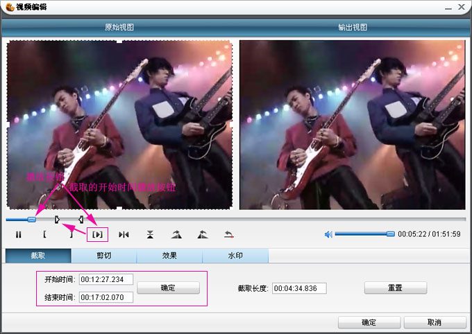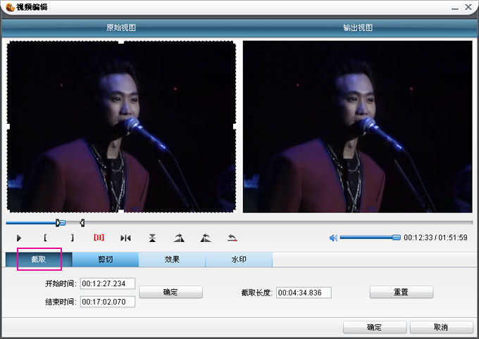 ;另外一种方式是输入时间00:12:27:234其中时间排序是时:分:秒:毫秒,有开始时间和结束时间输入设置,然后确定,点击确定的时候,上面的截取拖动按钮也随之移动。大家最好多操作熟悉一下此功能。