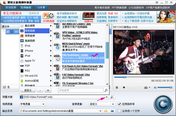 预置方案选择输出格式,也可以选择原视频格式 我这里添加的视频是rmvb格式,当然也可以选择其它格式如mp4等