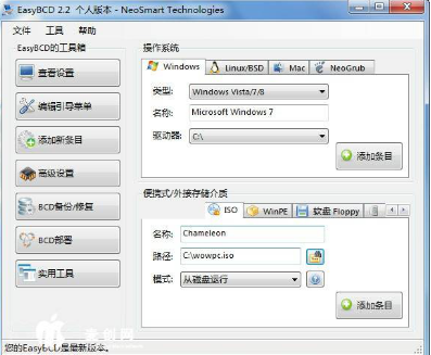 选择添加新条目后,我们选择添加ISO,名称这里你可以选择你喜欢的名字如:Mac或是Mac OS都行,我这里自己输入成Chaeleon以便于在引导的时候显示在选择的菜单,注意不要使用中文,以免显示出错,路径:这里我当时把wowpc.iso复制到了C盘根目录,当然为了尽量减少路径上的错误,还是麻烦你把wowpc.iso尽量放在少的路径下面。