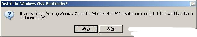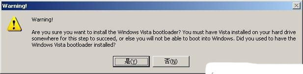 接着出现下图,问我们是否确认要暗黄Vista的Bootloader(启动加载),当然您的机子上一定要已经同时安装了Vista或Windows 7就可以点是继续。