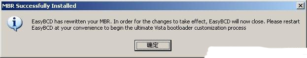这个时候,EasyBCD会重写MBR,加入Windows启动管理器引导入口,完成后提示如下窗口。