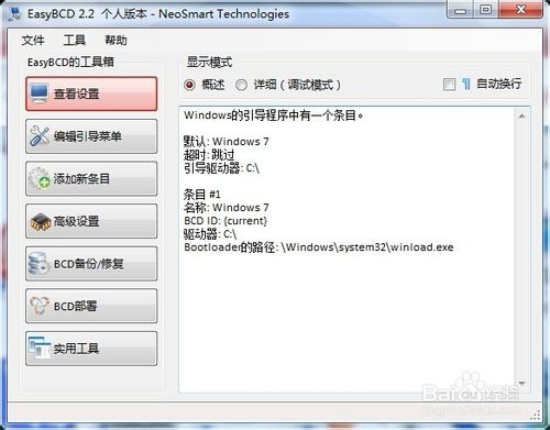 2打开easyBCD软件,可以看到目前只有一个win7启动项。