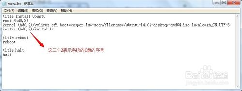 hd0后面的数字表示C盘在硬盘中的分区顺序,每个人的系统不大一样,不知道的可以在磁盘管理里面看一下,本人c盘是第三个分区,因此写为(hd0,2),如果是第一个,写为(hd0,0)即可。