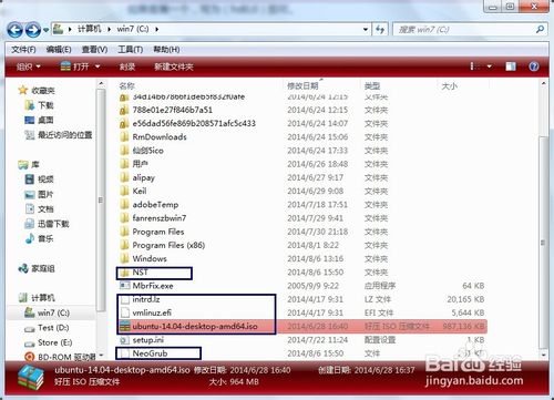 5将解压出来的两个文件复制到c盘根目录,可以看看c盘中添加了多少相关的文件。这样,安装系统的前期准备就完成了,可以重启电脑准备安装ubuntu14.04了。