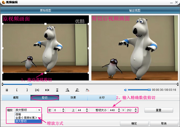 剪切掉视频黑边之后,设置放大剪切的缩放方式||注意试下全景(保持长宽),然后注意观察剪切后视频画面上是否还有黑边,若没有,则点击确定按钮回到软件主界面。