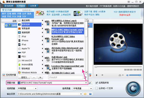 接下来设置输出视频格式,点击预置方案后面的工具栏设置输出视频格式,可以选择保持原视频格式输出或者转换视频格式输出。