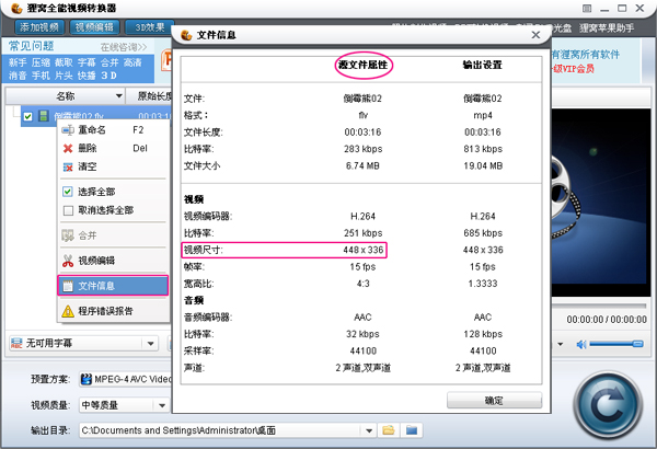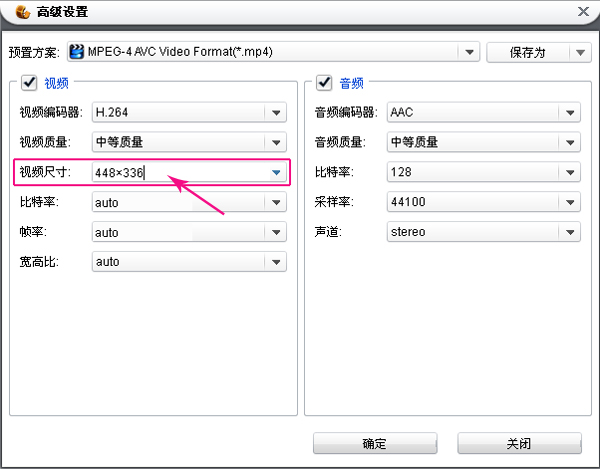 如上图,记住原视频尺寸为448×336,然后点击预置方案后面的工具按钮进入高级设置,在视频尺寸选项处,手动输入448×336,然后点击确定,这样就可以保持原视频尺寸输出。
