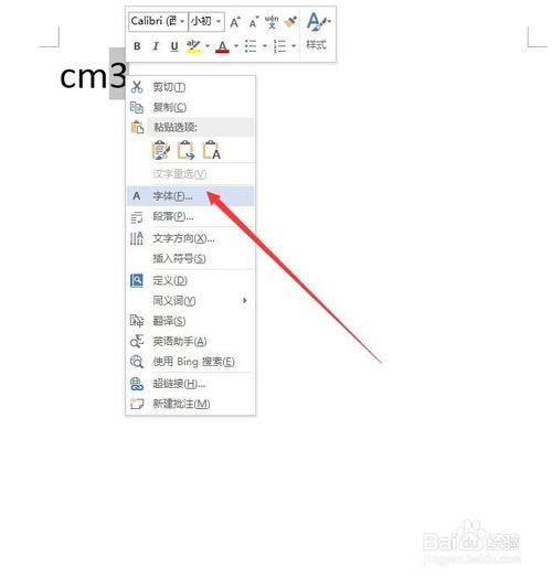 在Word中输入cm3,然后用鼠标选中“3”,然后鼠标右键。